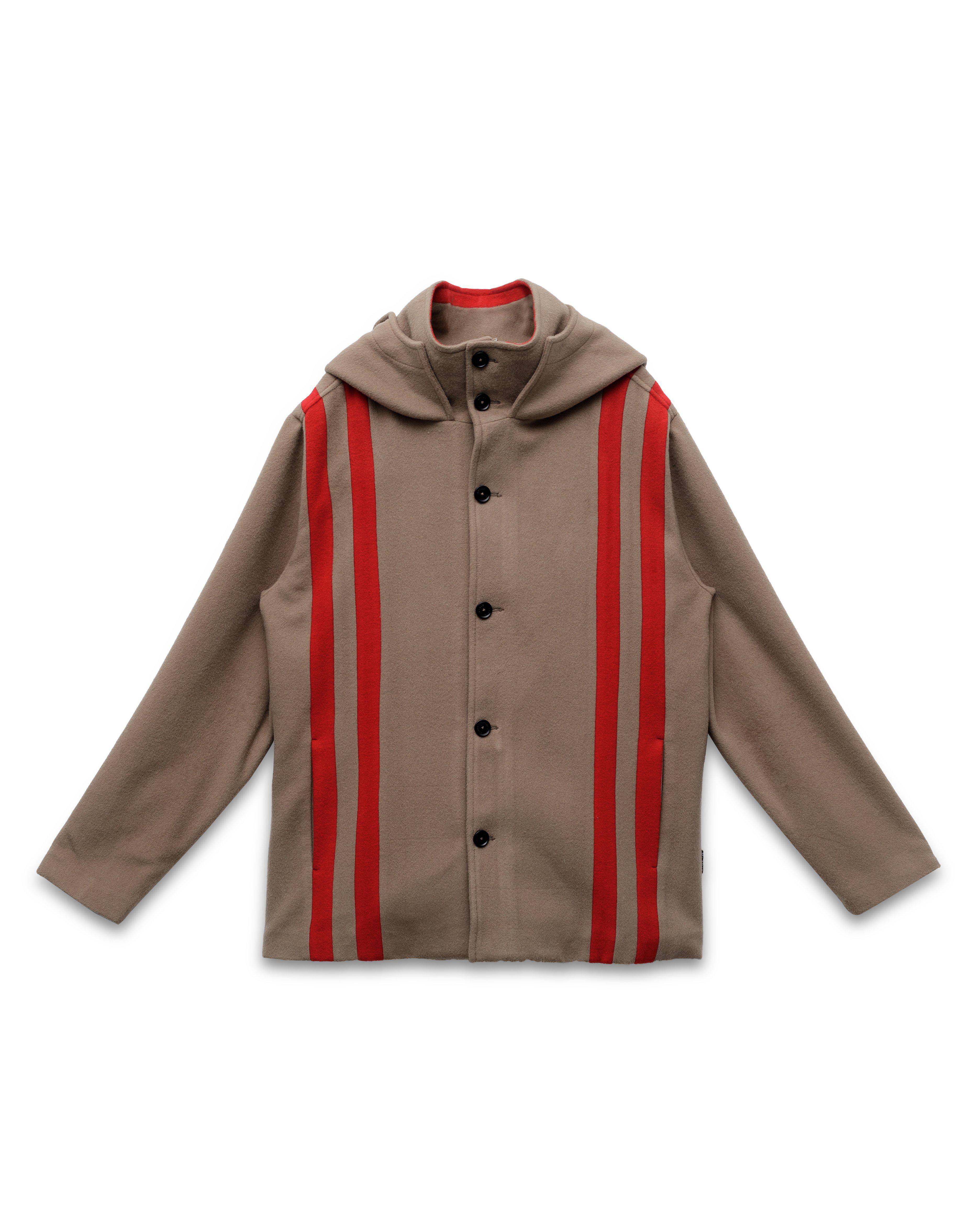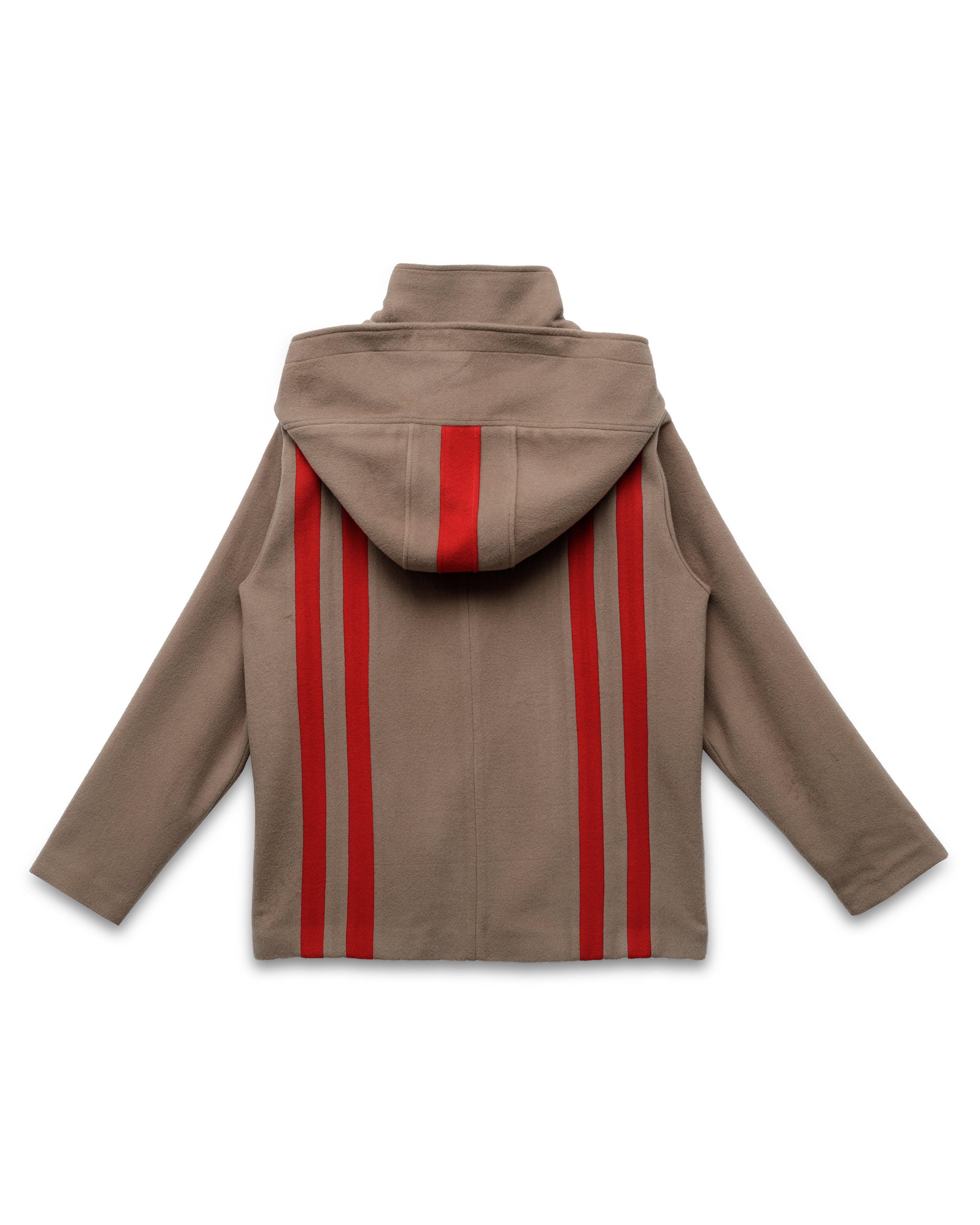 Wool blend, single-breasted half coat with an oversized hood featuring red vertical stripes on the front and back.