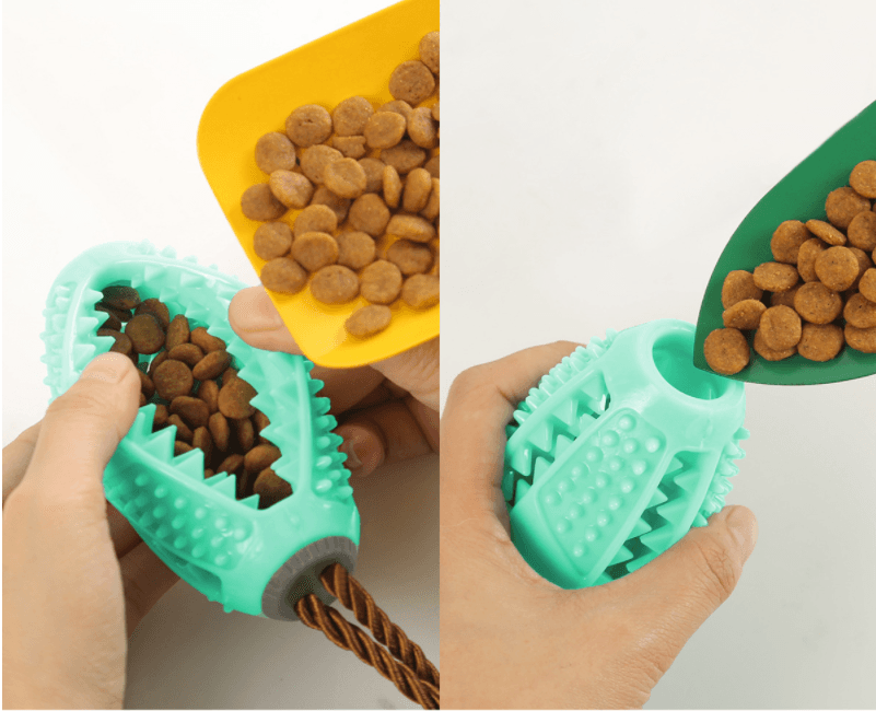 But that's not all - this toy also offers a convenient way to load and retrieve dog food. Simply fill the food leak with multiple dog treats and watch as your furry friend enjoys a tasty reward while keeping their teeth clean. It's a win-win situation!