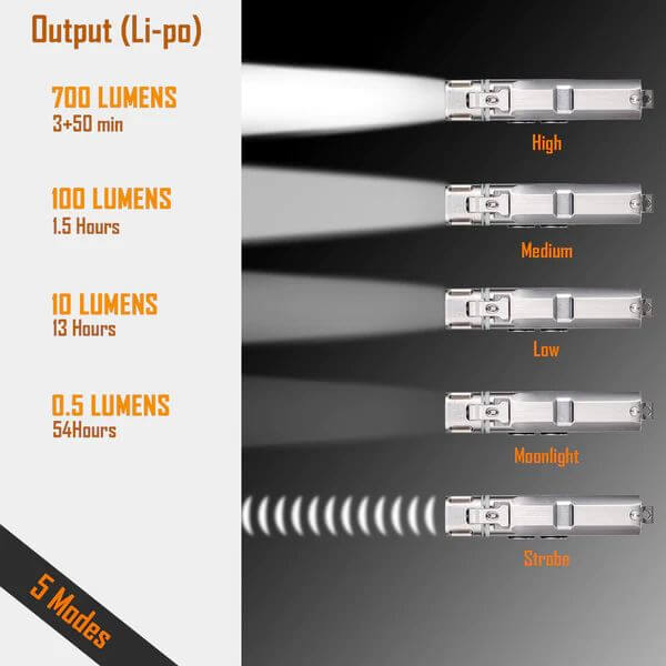 The possible output levels are 4 and when using the integrated Li-po cell they are divided as follows: we have a very low level of 0.5 lumens, Low, which guarantees a runtime of 54 hours, then there is the Low level of 10 lumens with a runtime of 10 hours, then the Medium level of 100 lumens and a runtime of 1.5 hours and finally a high level of 700 lumens with a runtime of 3 minutes + 50 minutes. There is also the option to use a Strobe level with High output.