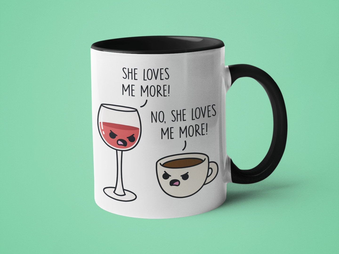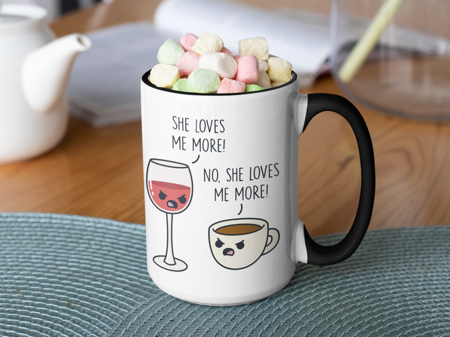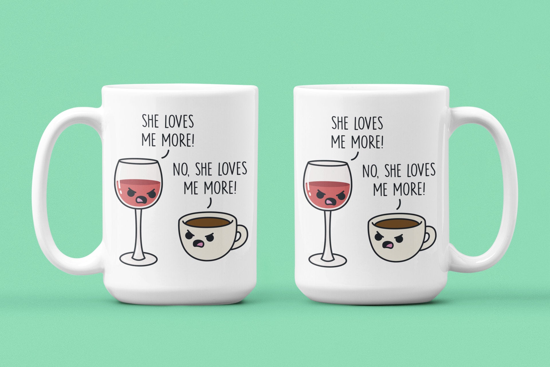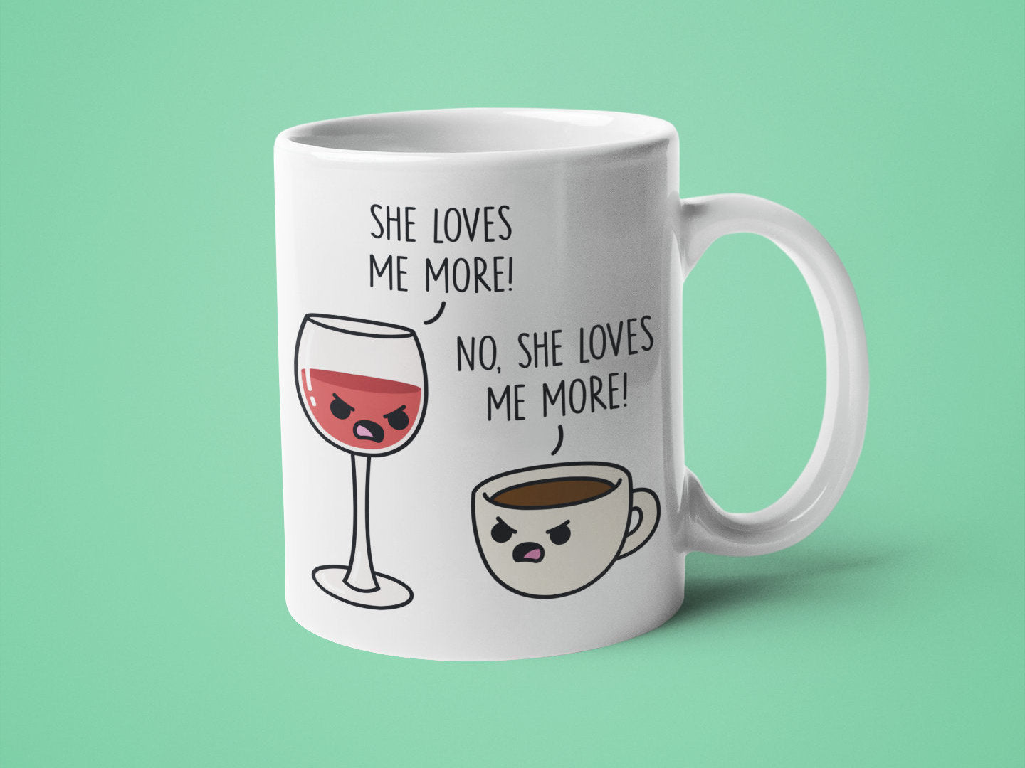 This funny "She Loves me More' mug makes a great gift for moms or anyone who loves wine and coffee! Makes a great birthday or Christmas gift!