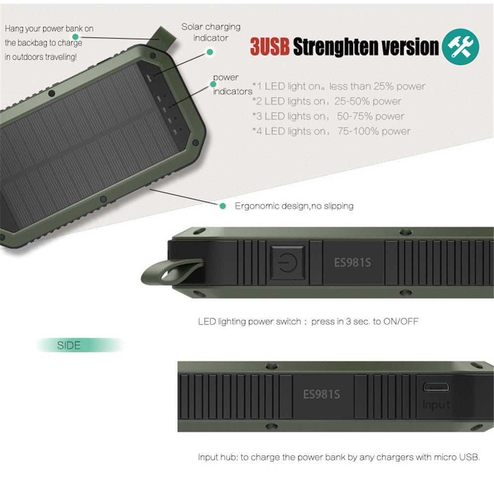 This charger with boosting charging capability can simultaneously charge 2 to 4 devices with its built-in Qi-standard wireless charger, and multi-port USB ports. Charge any mobile phone 150% fully and charge any Tablet 100%. Also charge many devices like Cameras, Watches, and Toys 100%. The huge power capacity takes care of it all. The Solar panel charges your power bank and regenerates all the power again. This water-resistant power bank is perfect for indoors or outdoors and for quickly lighting up an area 8 ft x 8ft with its LED floodlights. The built-in power regulator will not overcharge your devices. The whole power bank is shockproof and dustproof as well as water-resistant. With this solar charger, you feel you have the power. The advanced light-absorbing solar panels take every light source and use it to convert stored power. A true Sun Chaser- Mini, it works most efficiently in the daytime in sunlight and stores power that can be used any time anywhere outdoors or indoors.