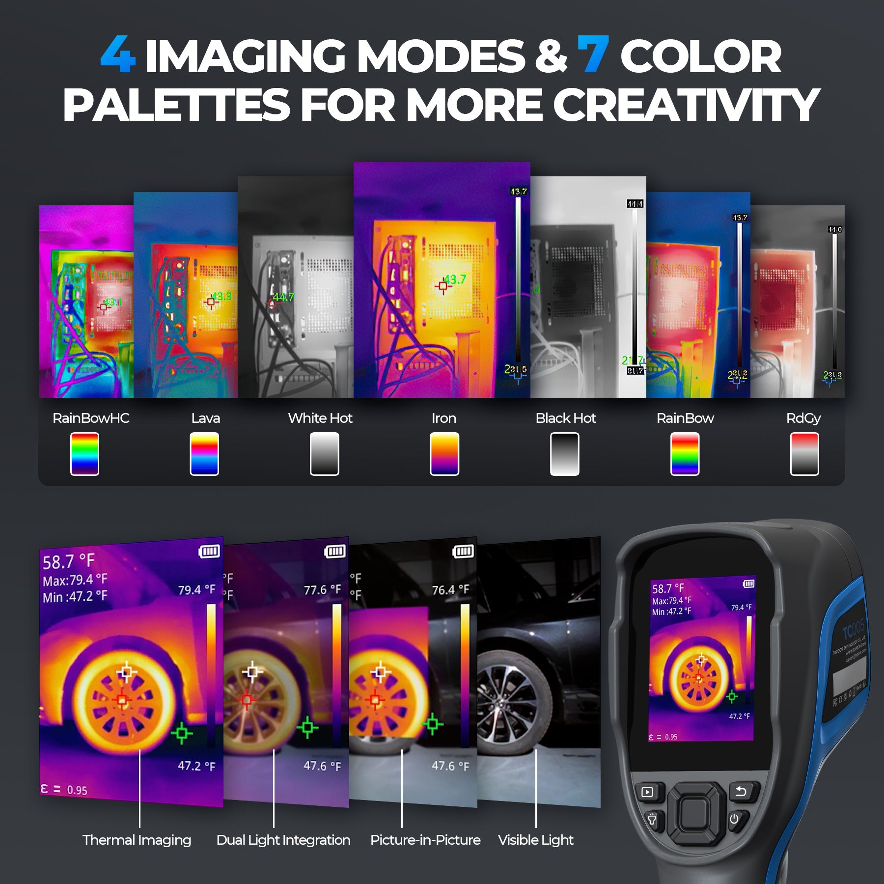 The TC005 is a handheld thermal camera that measures an expansive temperature range. From -20°C to 550°C (-4°F to +1022°F), and offers a 12-hour runtime. The high-resolution 256*192 pixel infrared camera allows you to say goodbye to blurry images. The tool is ready for analysis with the standalone and the PC modes, enabling users to project and upload images from the TC to their PC. Added benefits of the TC005 include seven options for Pseudo-Color Display, a 2-megapixel visible light camera for overlapping images, and a picture-in-picture mode.