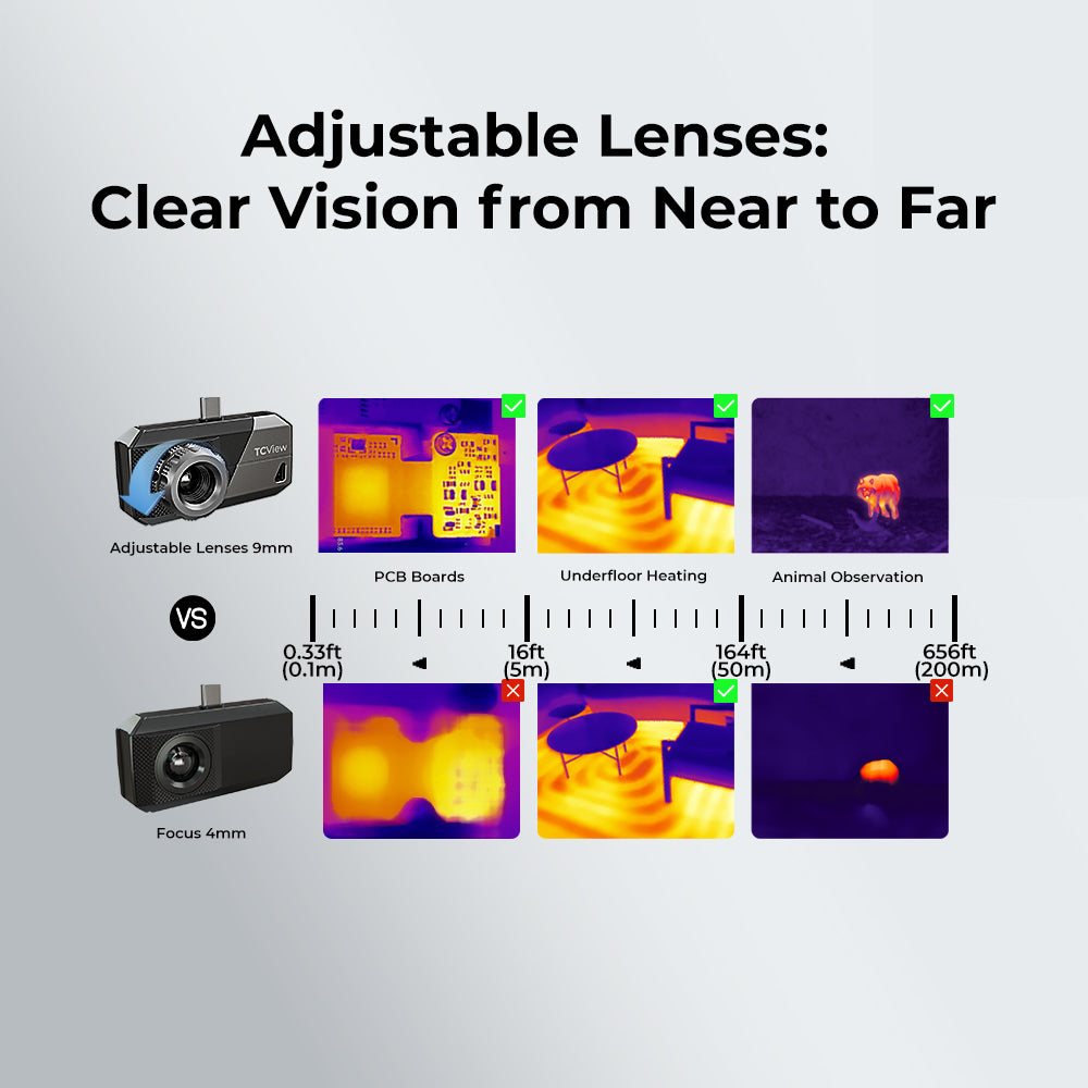 • The TS001 boasts adjustable 9mm lenses, accommodating infrared imaging needs from 0.32 to 1640 feet (0.1~500m) to ensure clarity whether viewing objects up close or at a distance.