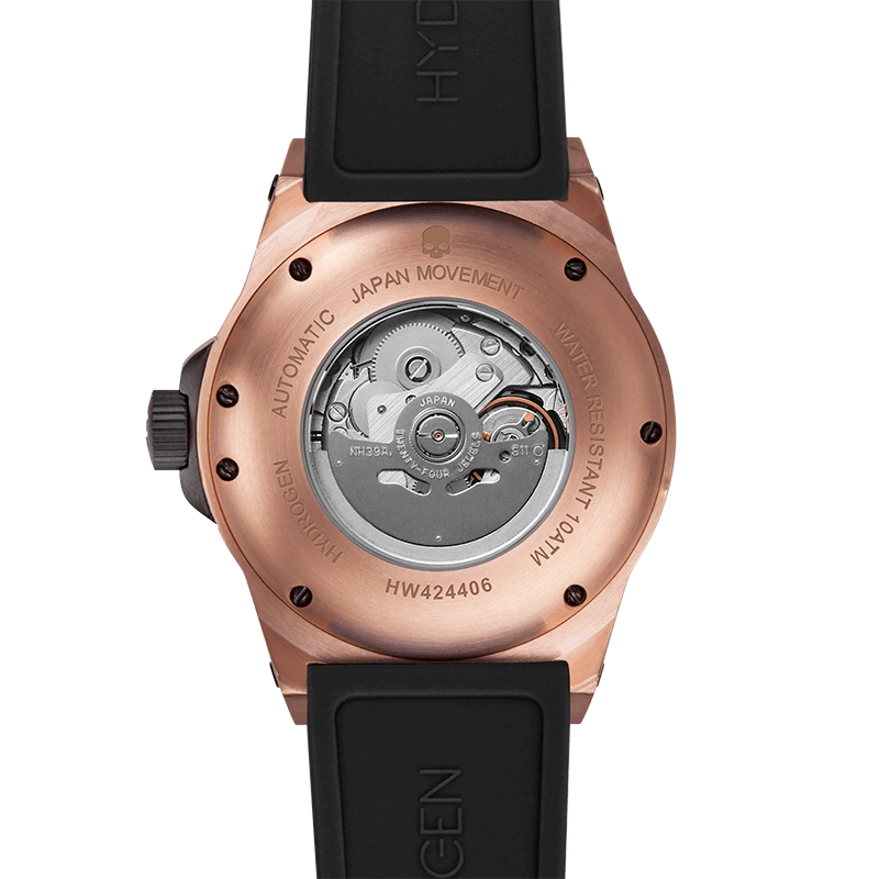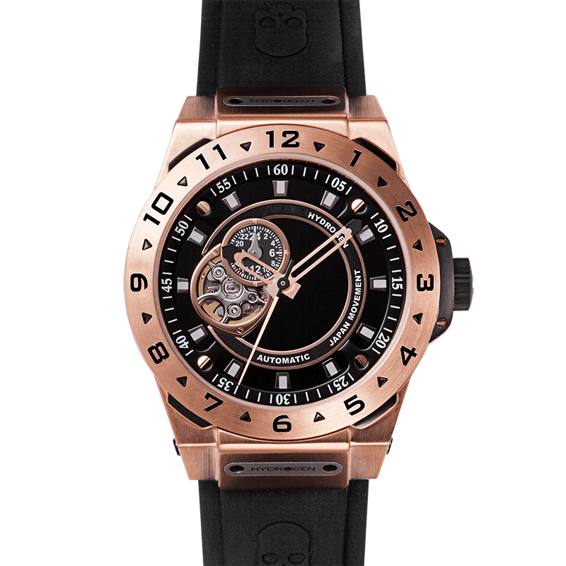 This Vento model represents the pursuit of adventure influenced by fashion. Featuring a 44mm stainless steel case plated in rose gold, with a black dial and custom molded black silicone strap. Powered with an Made in Japan Automatic Movement, this Hydrogen Watch feature also 10 ATM or screw down crown.