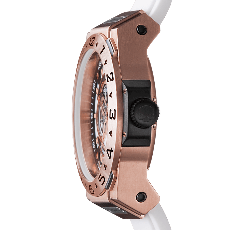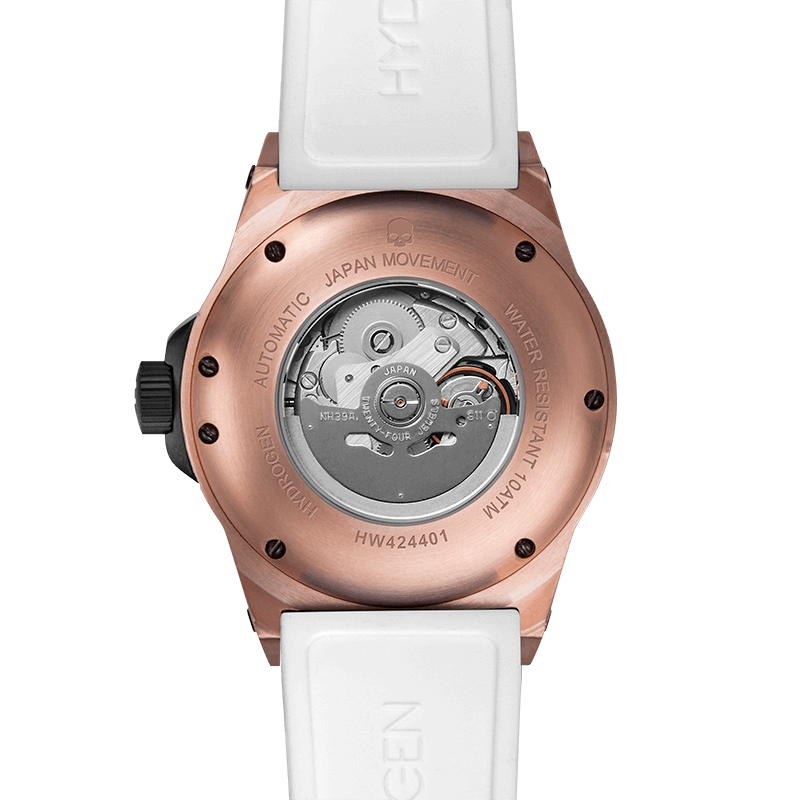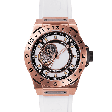 This Hydrogen Watch from the Vento collection represents the pursuit of adventure influenced by fashion. Featuring a 44mm stainless steel case plated in rose gold, with a white dial and custom molded white silicone, it stand out. The automatic movment is a masterwork Made in Japan.