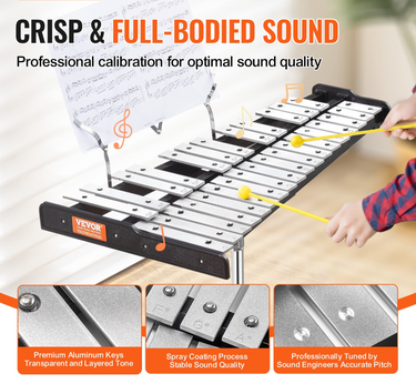 PRODUCT DESCRIPTION VEVOR 30 Note Glockenspiel Xylophone Bell Kit, Professional Percussion Instrument Set with Mallets, Drum Sticks, Music Stand, 8" Practice Pad, Adjustable Stand and Carrying Bag for Students & Adults
