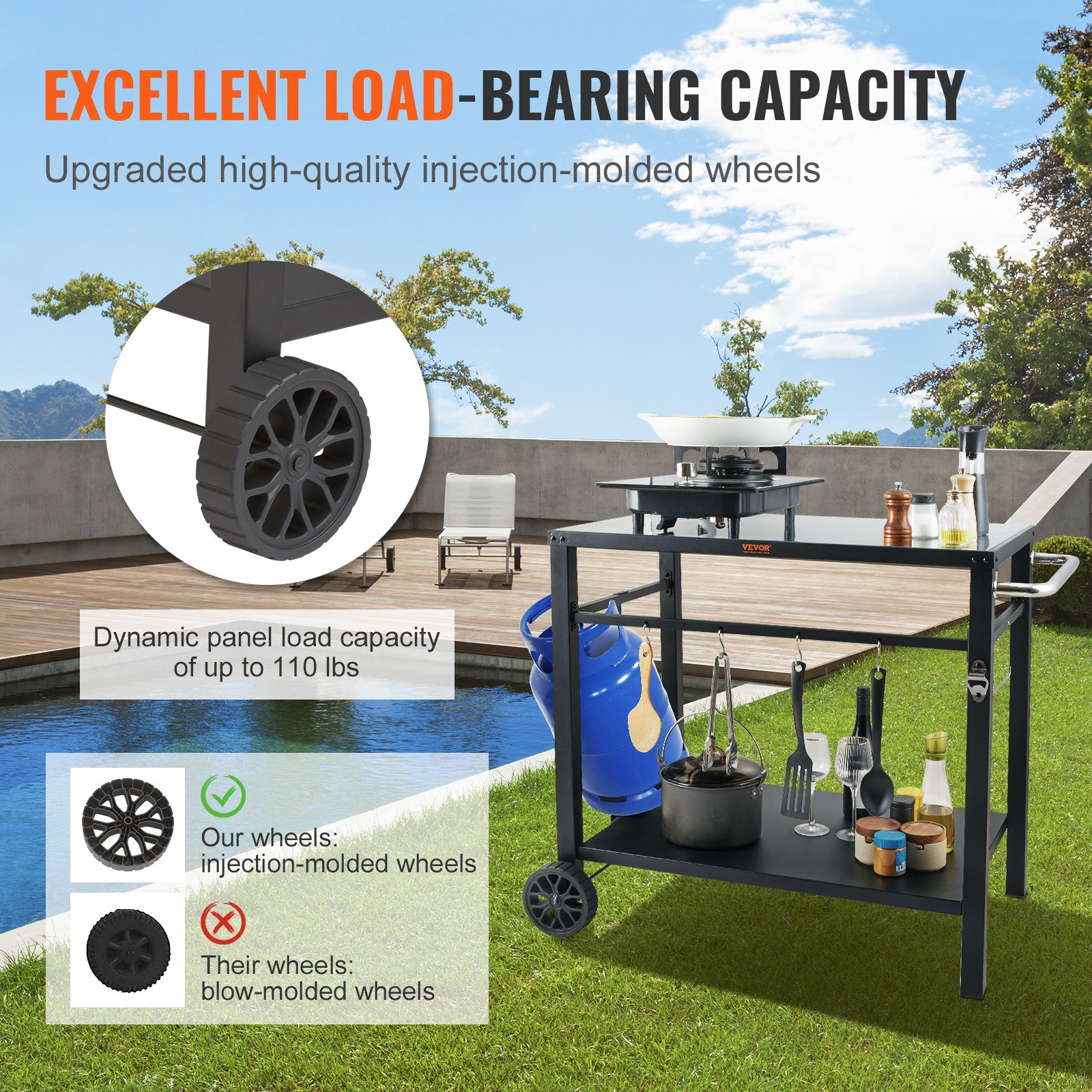 (FINAL PRICES ARE LOWER ON OUR SITE!) VEVOR Outdoor Grill Dining Cart with Double-Shelf, BBQ Movable Food Prep Table, Multifunctional Iron Table Top, Portable Modular Carts for Pizza Oven, Worktable with 2 Wheels, Carry Handle, Black