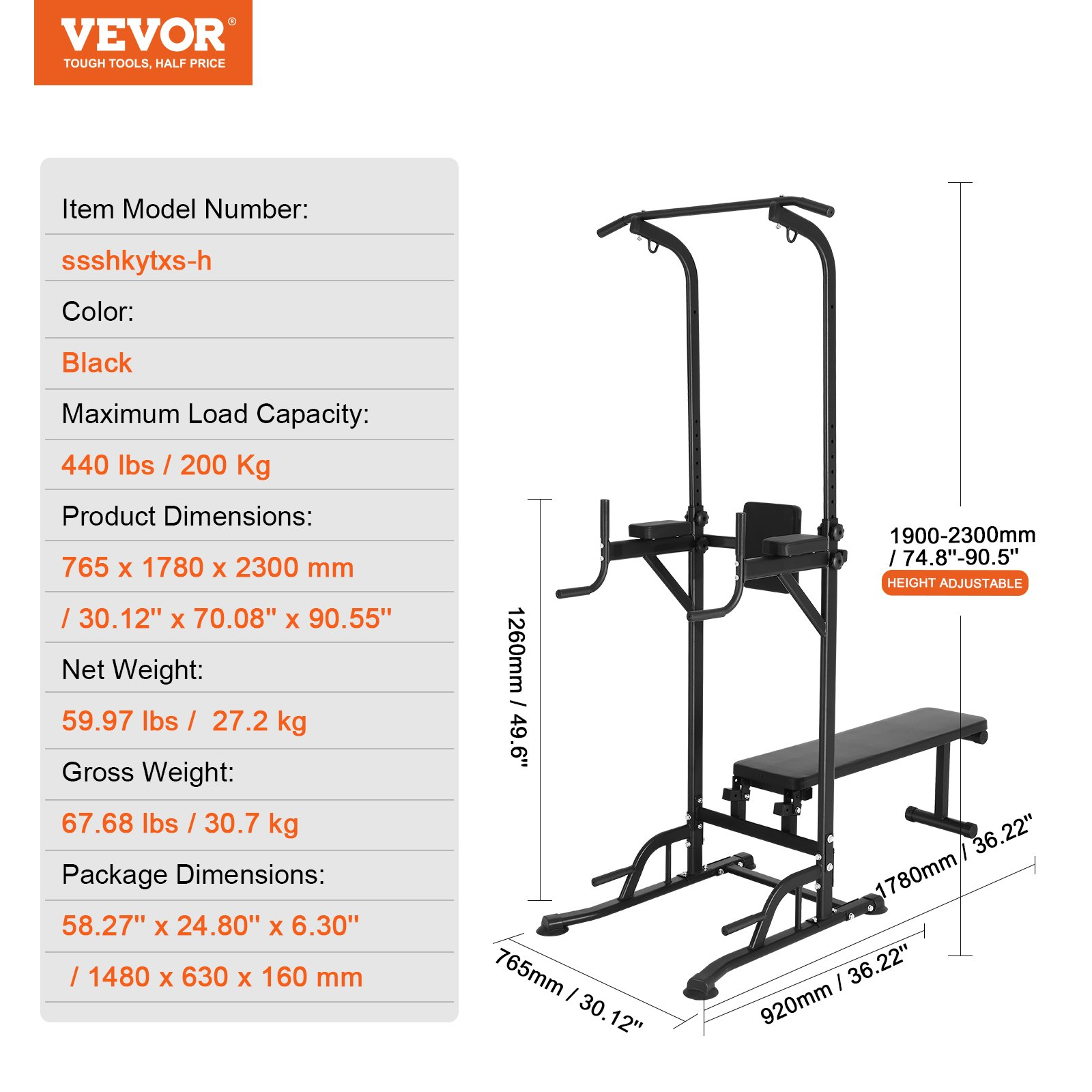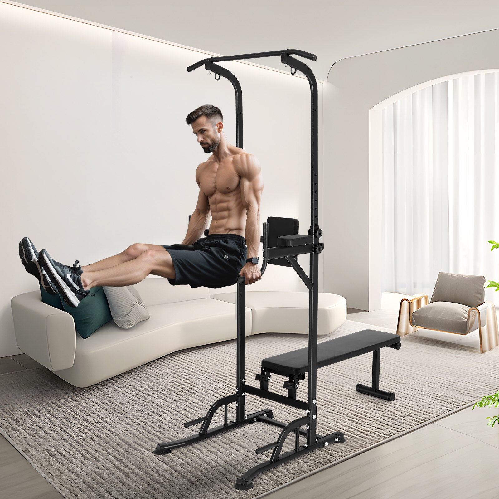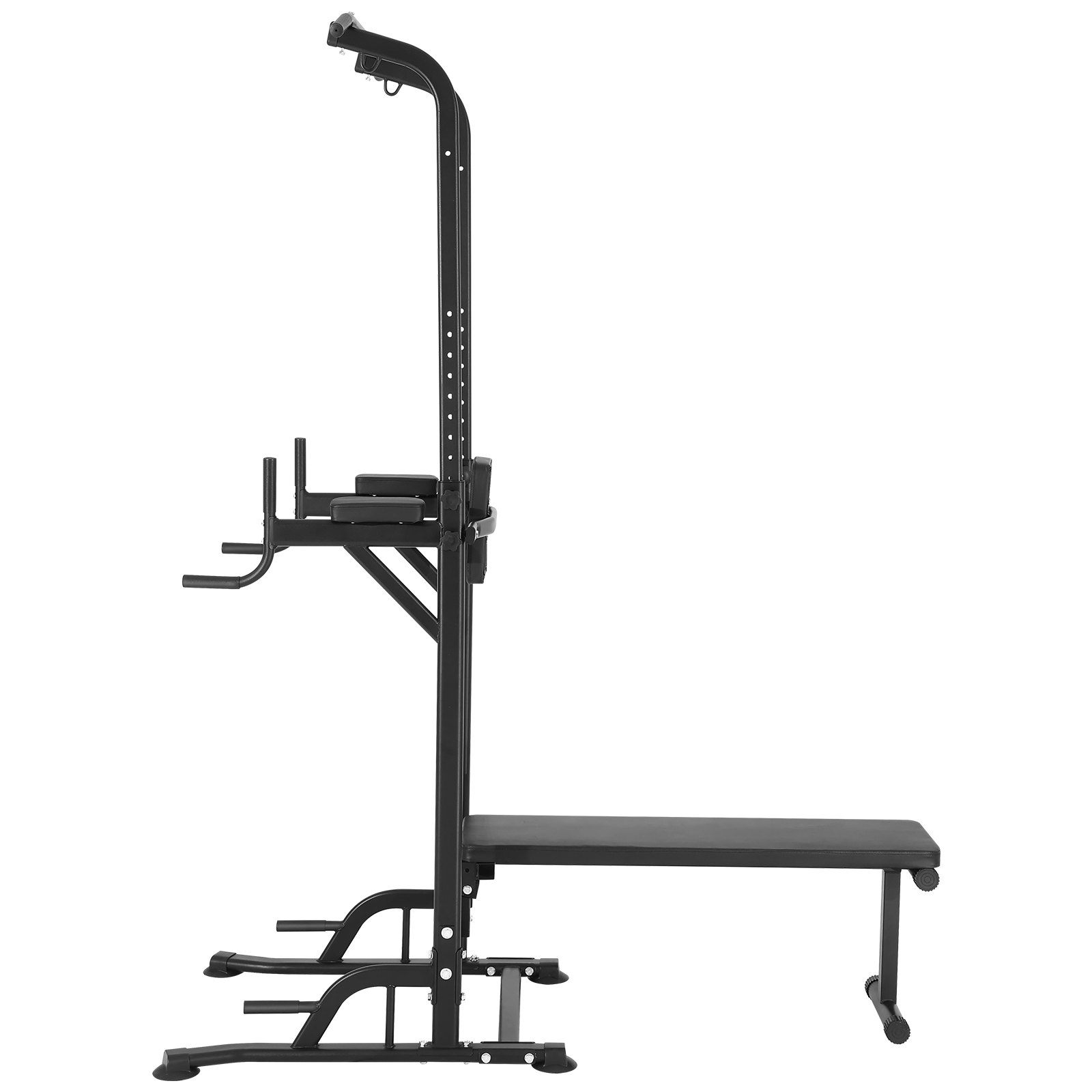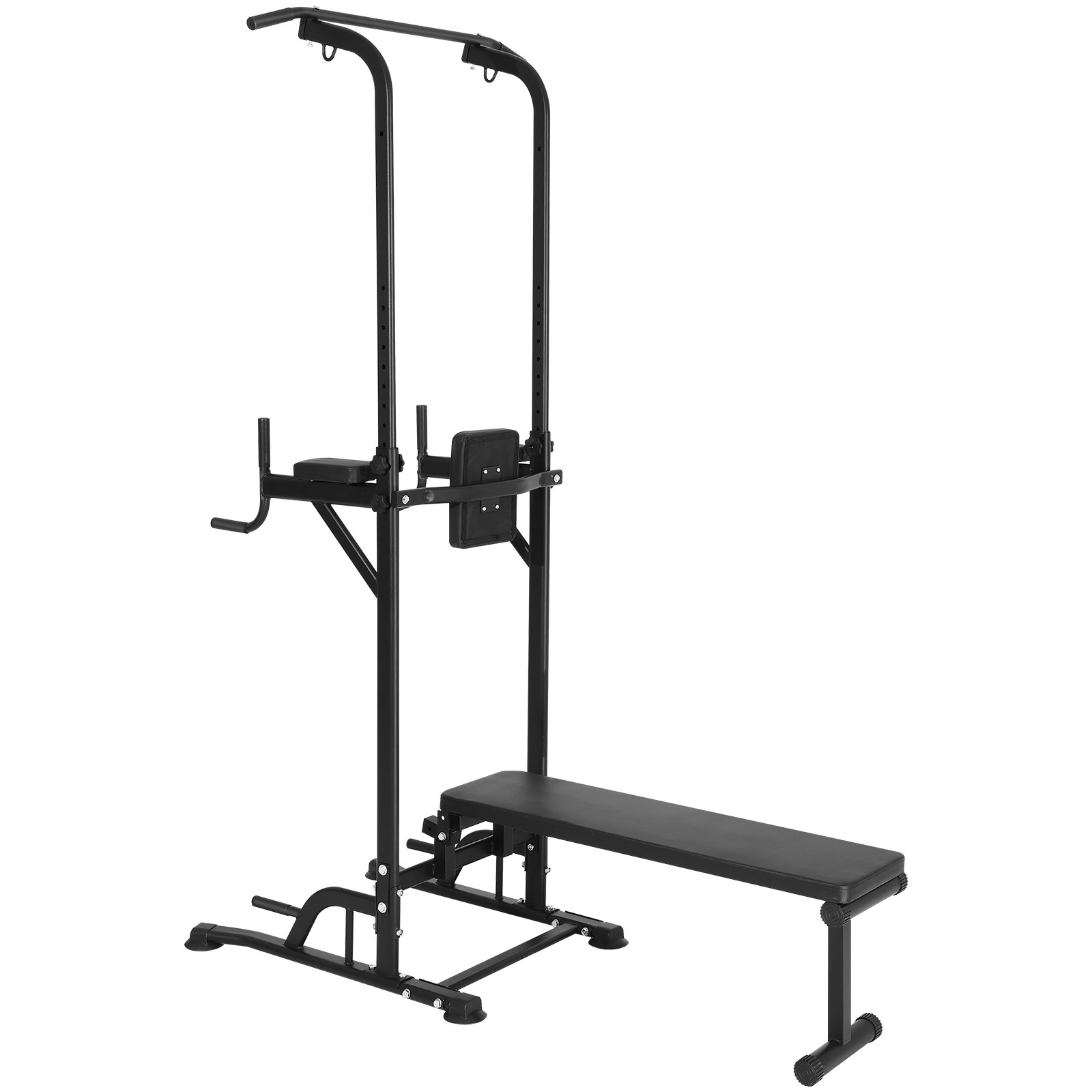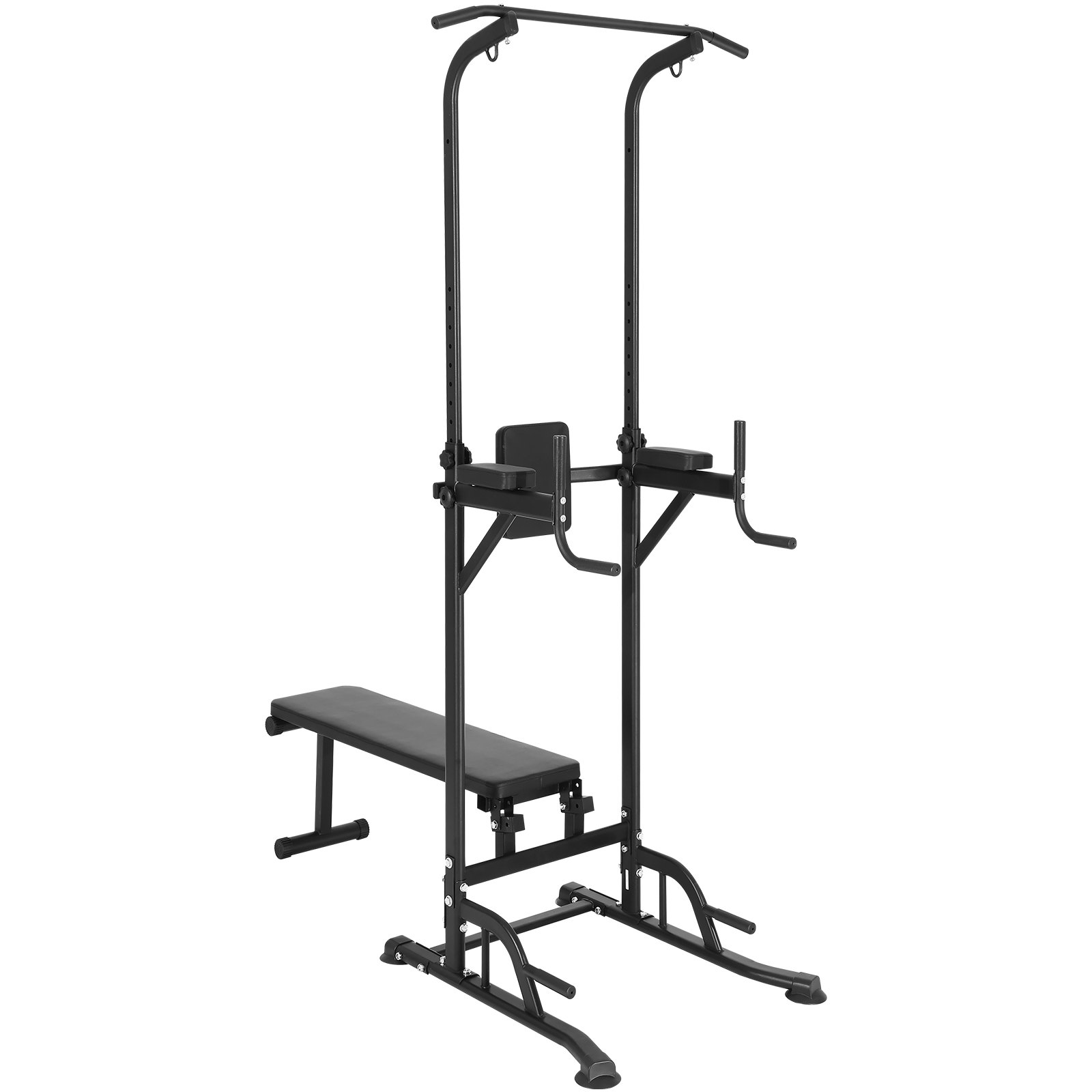 PRODUCT DESCRIPTION VEVOR Power Tower with Bench, 10-Level Height Adjustable Pull Up Bar Stand Dip Station & Detachable Bench, Multi-Function Home Gym Strength Training Fitness Equipment with Backrest, Elbow Pads, 440LBS