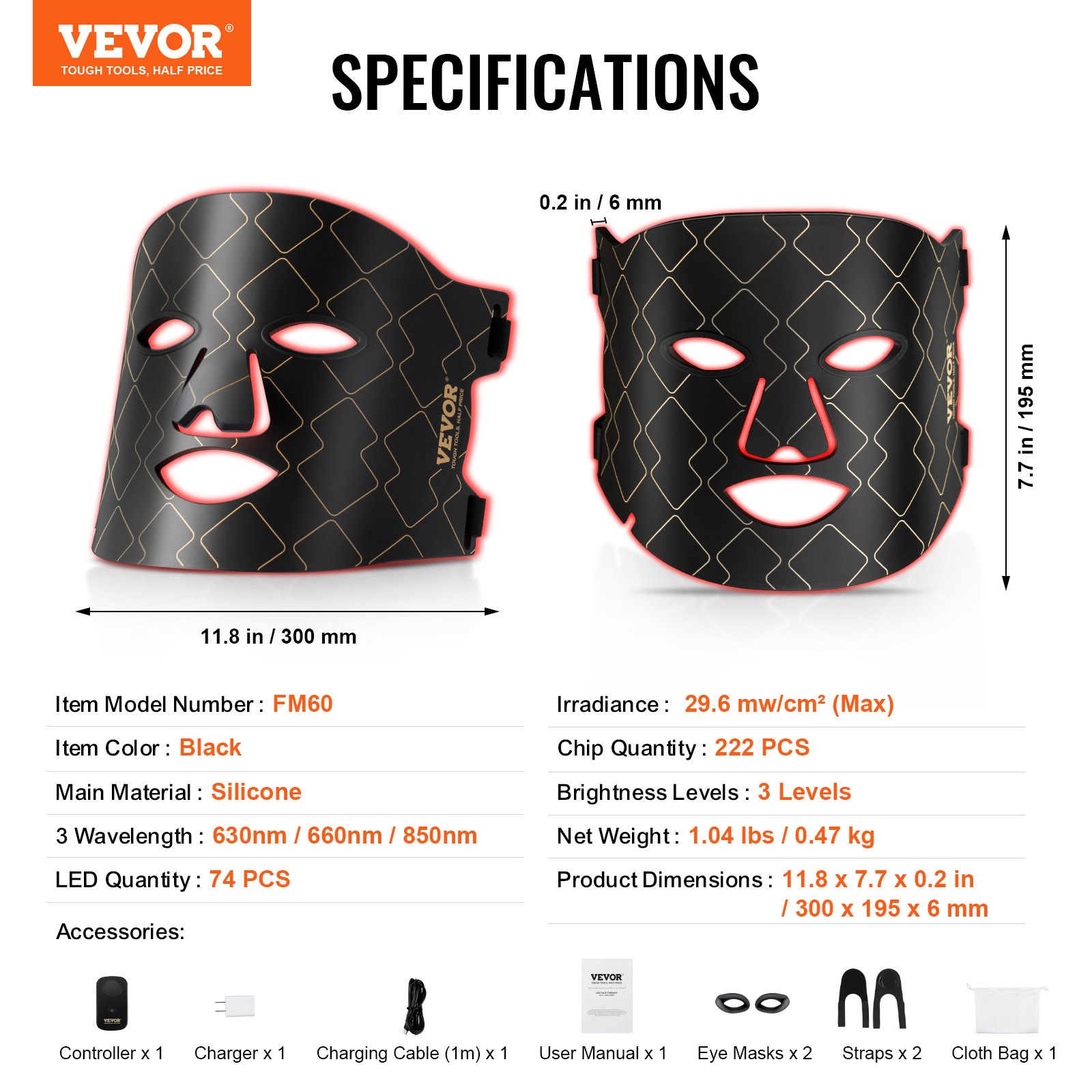 3 Wavelength: 630nm / 660nm / 850nm,LED Quantity: 74 PCS,Item Color: Black,Item Model Number: FM60,Chip Quantity: 222 PCS,Irradiance: 29.6 mw/cm² (Max),Brightness Levels: 3 Levels,Product Dimensions: 11.8 x 7.7 x 0.2 in / 300 x 195 x 6 mm,Net Weight: 1.04 lbs / 0.47 kg,Main Material: Silicone