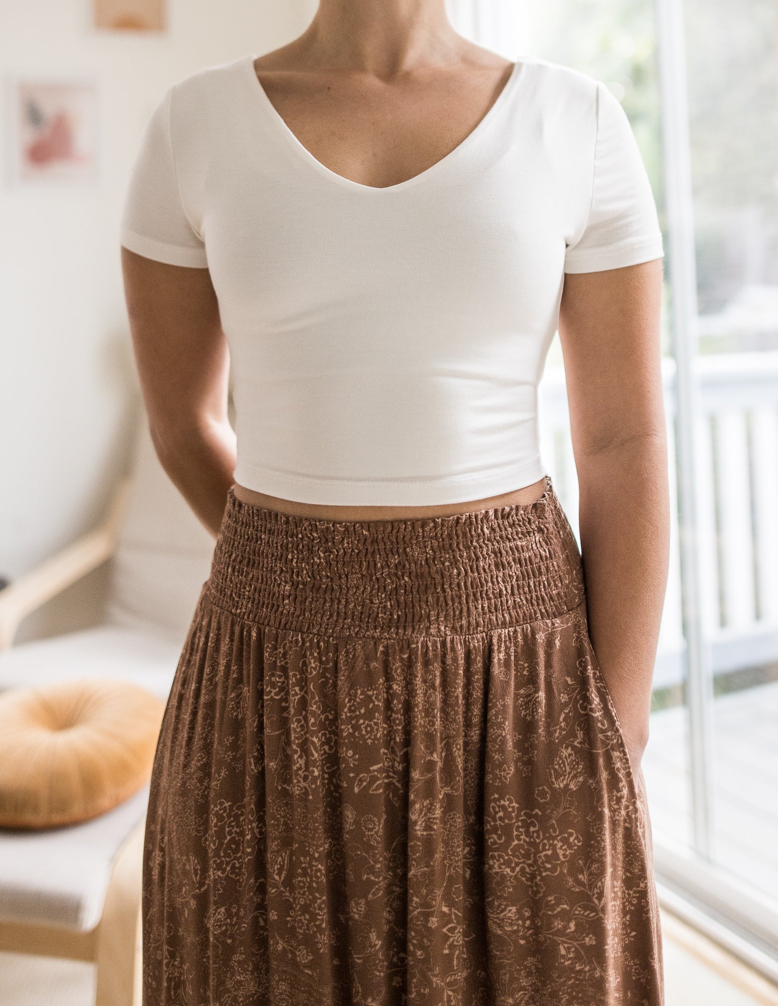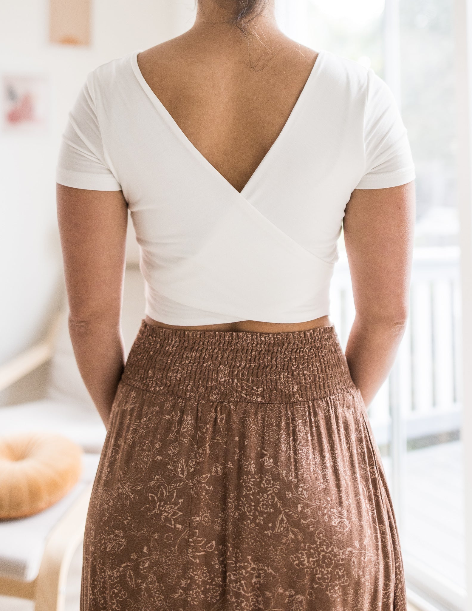 Luxuriously soft double-layered reversible crop top with overlapping criss-cross front (or back) and v-neck back (or front). * Inner layer is purposefully not sewn onto the bottom hem or side seams.