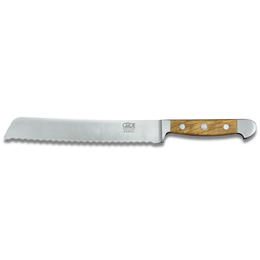 With the Alpha Olive bread knife and its 8 inch long blade, you can cut any bread, hard or soft crusted, into even slices. The one-sided hand-ground blade with the famous Gude serrated edge made of chrome-vanadium-molybdenum knife steel makes bread slicers superfluous.