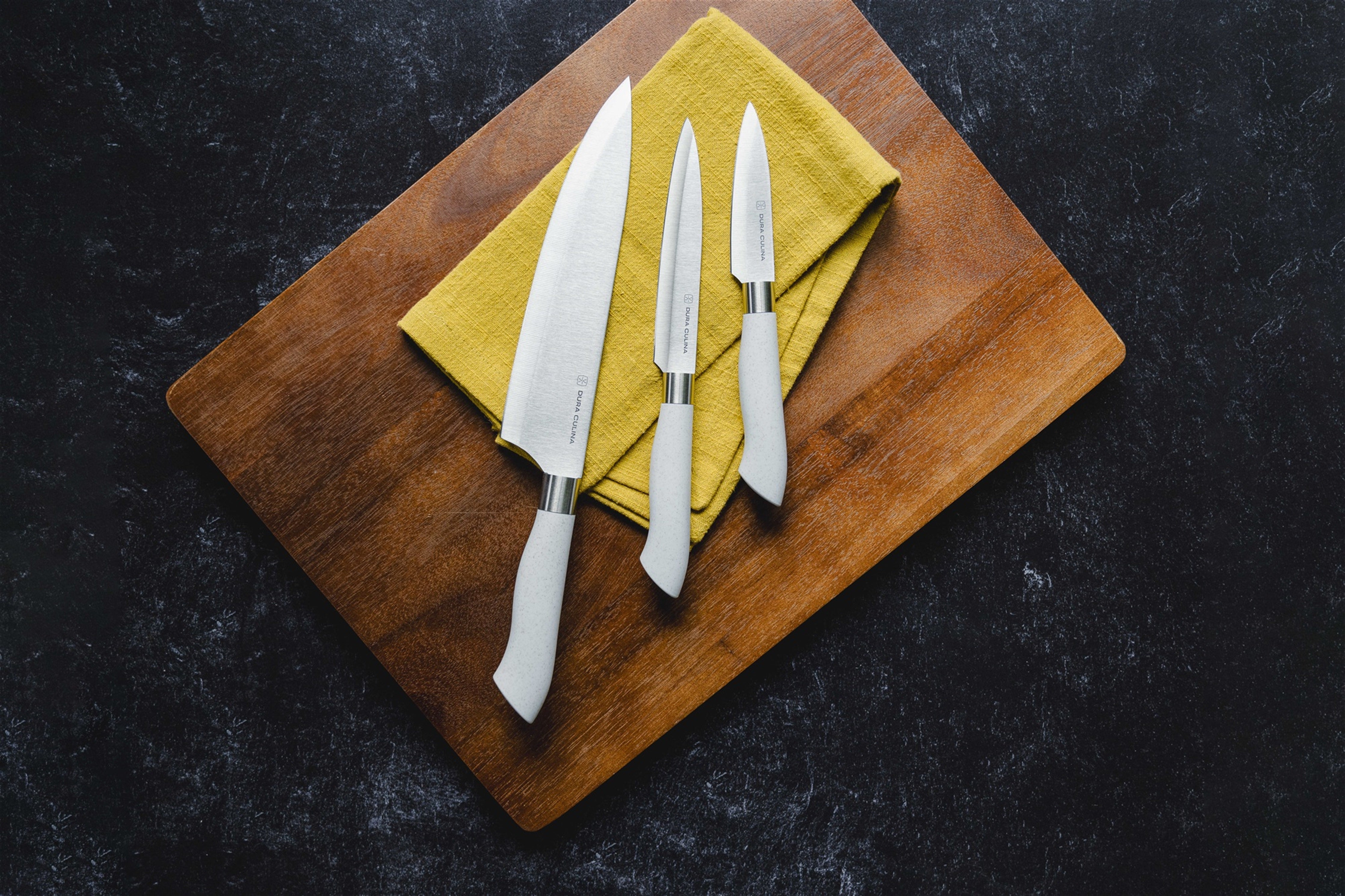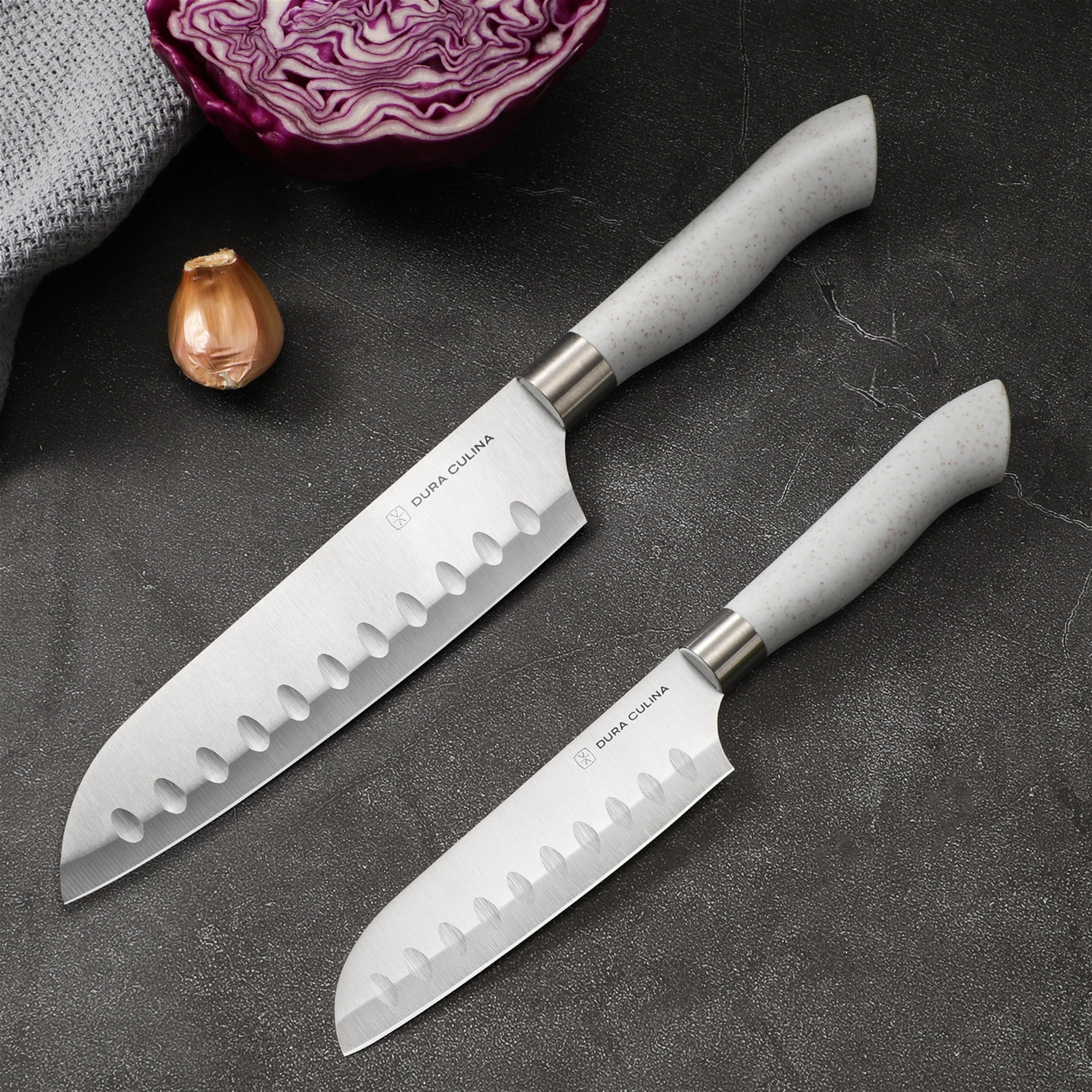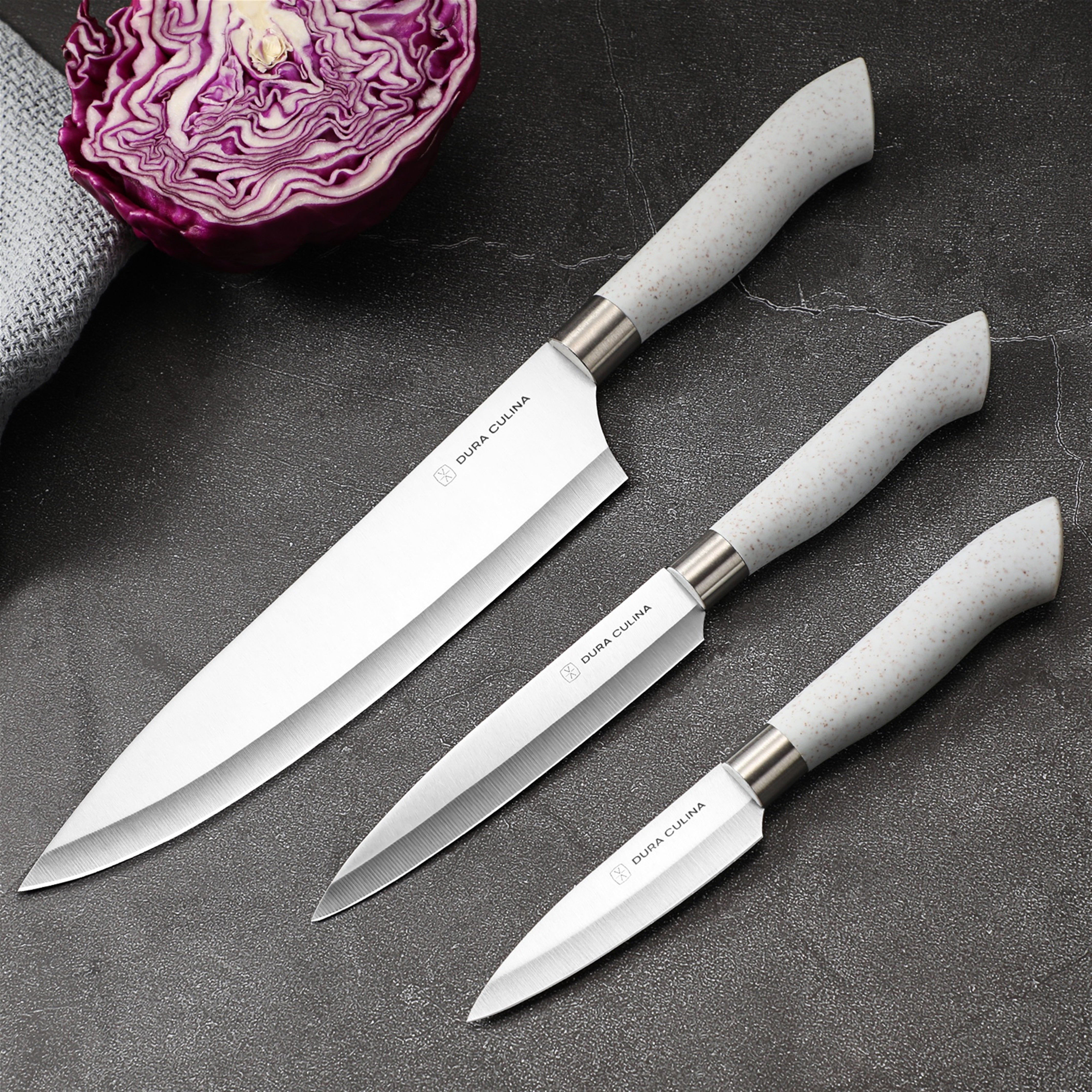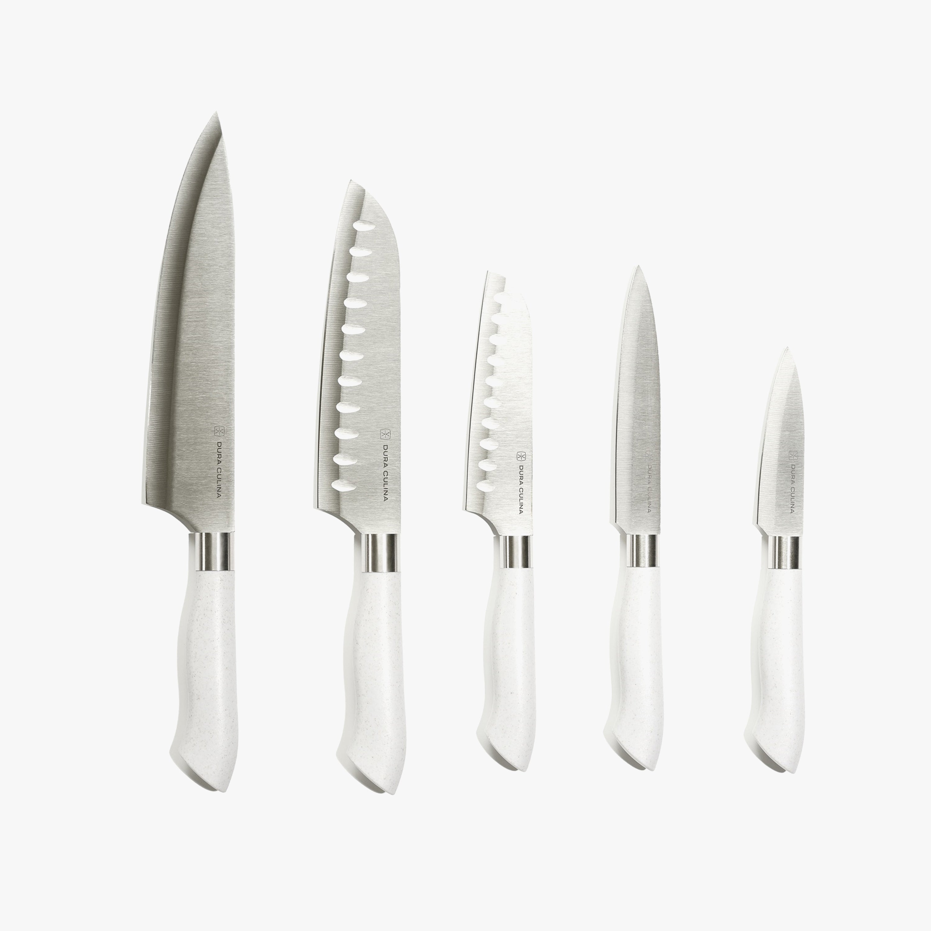 Upgrade your kitchen with the Dura Living EcoCut 10-Piece Kitchen Knife Set. Crafted with high carbon stainless steel blades, this set ensures superior sharpness and durability. The sustainable ergonomic handles provide a comfortable and secure grip, making them perfect for eco-conscious consumers. Each knife comes with its own sheath for safe storage and protection. Key Features: - **High-Carbon Stainless Steel Blades:** Offers exceptional sharpness and precise cutting for all your kitchen needs. - **Sustainable Ergonomic Handles:** Made from eco-friendly materials, designed for comfort and control. - **Includes Sheaths:** Each knife comes with a sheath for safe storage and blade protection. - **Versatile Set:** Includes various knives to handle all your kitchen tasks from chopping to slicing. - **Eco-Friendly Design:** Ideal for those who value sustainability in their kitchen tools. Whether you’re a professional chef or a home cook, this 10-piece knife set provides the perfect combination of performance, sustainability, and style. Enhance your culinary skills with the precision and eco-friendly design of the Dura Living EcoCut Kitchen Knife Set.