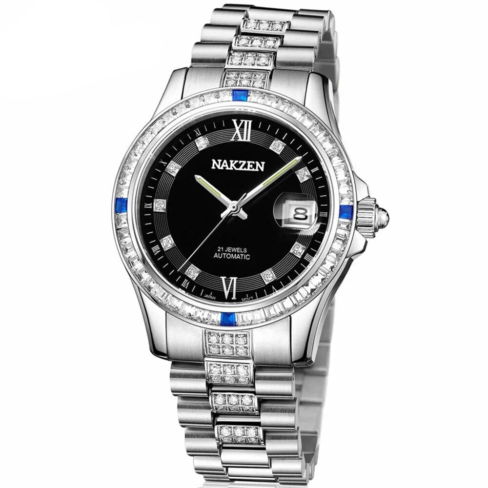 NAKZEN Men Japan NH35 Movement Automatic Mechanical Watch Elegant Diamond Stainless Steel Bracelet Watches Relogio Masculino