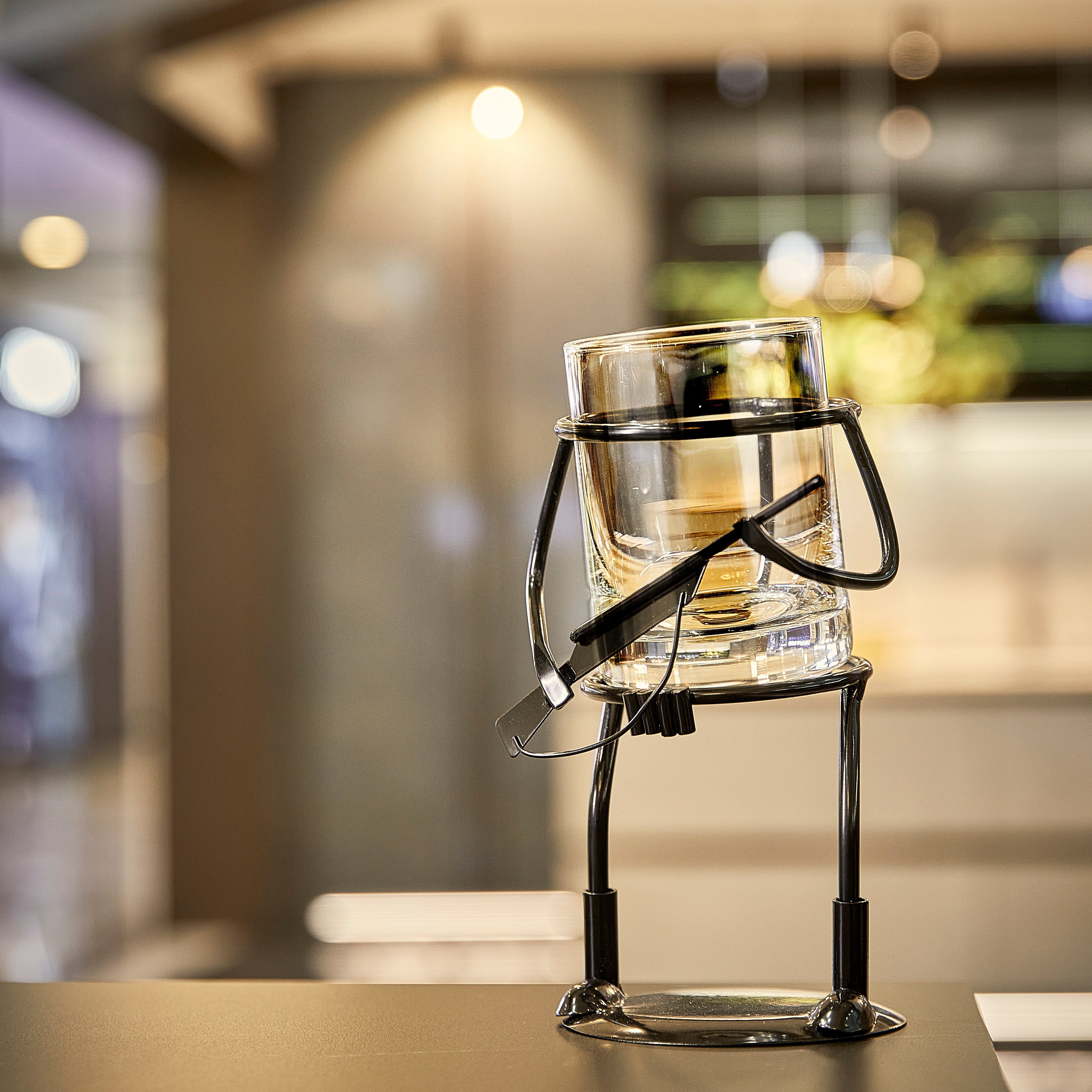 - With a wide, round metal base, the Metal Hunter Cup Holder by Gute is stable and resistant to bumps and spills. This design ensures you wont have to fear a catastrophic spill while simultaneously making it easy to rest your glass! The small size is perfect for small or large spaces, countertops, and tabletops within your home.