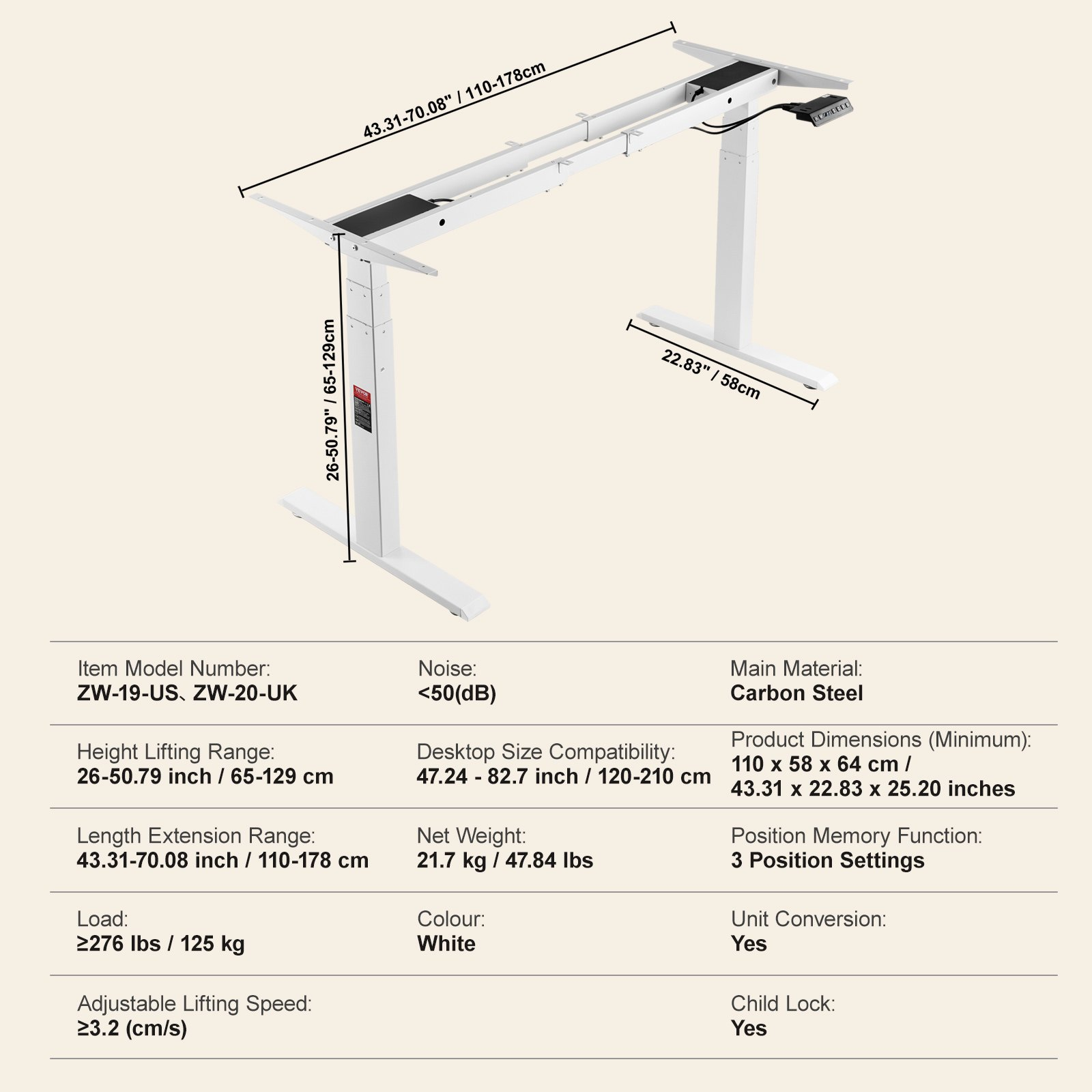 Load: ?276 lbs / 125 kg,Child Lock: Yes,Noise: Less than 50(dB),Unit Conversion: Yes,Height Lifting Range: 26-50.79 inch / 65-129 cm,Product Dimensions (Minimum): 110 x 58 x 64 cm / 43.31 x 22.83 x 25.20 inches,Adjustable Lifting Speed: ? 1.26 in /s(3.2 cm/s),Position Memory Function: 3 Position Settings,Model: ZW-19,Length Extension Range: 43.31-70.08 inch / 110-178 cm,Desktop Size Compatibility: 47.24 - 82.7 inch / 120-210 cm,Net Weight: 21.7 kg / 47.84 lbs,Main Material: Q235A Cold Rolled Carbon Steel